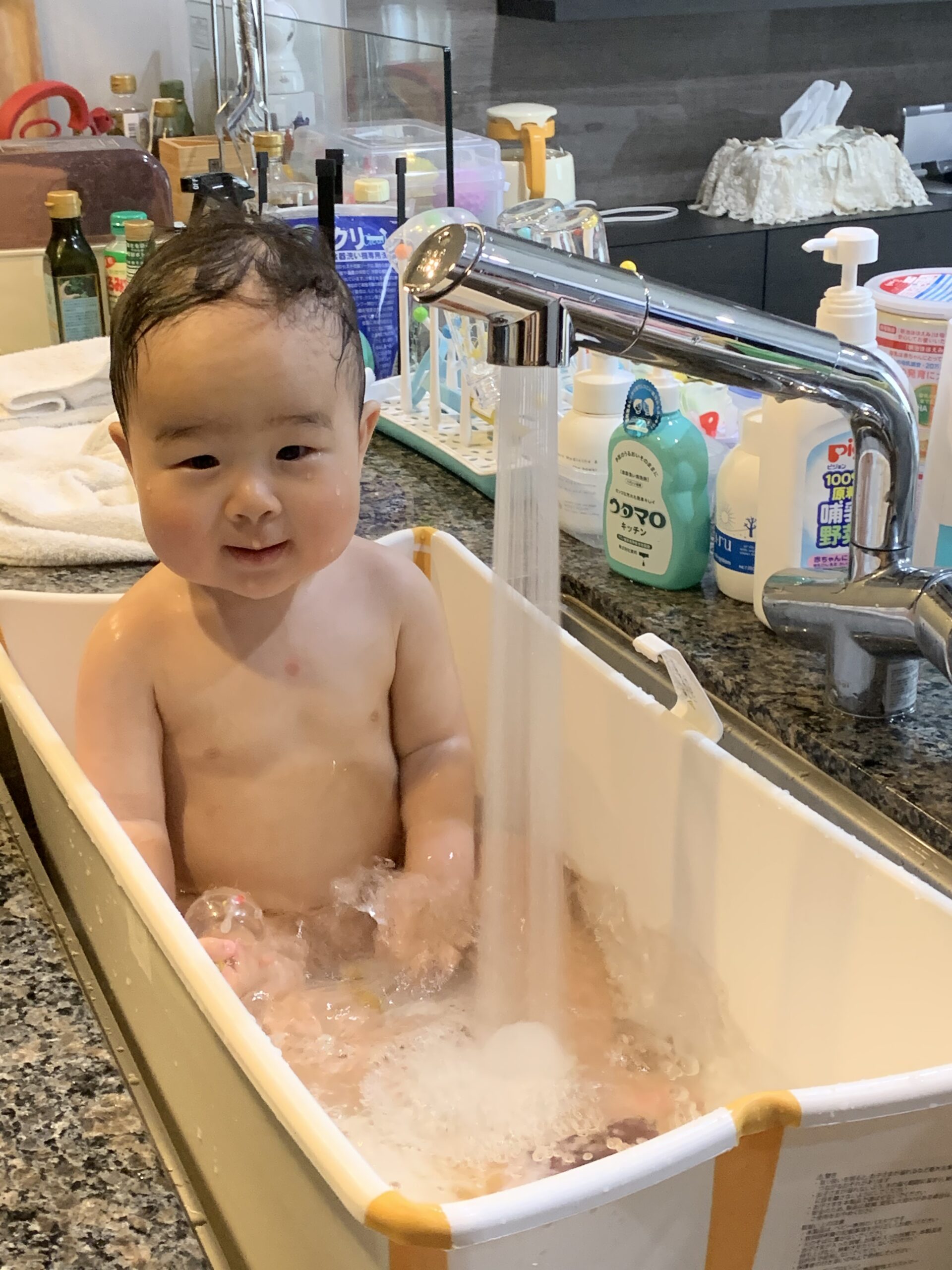 ぬるま湯を湯船にはり、産後ヘルパーはプール監視員♡
