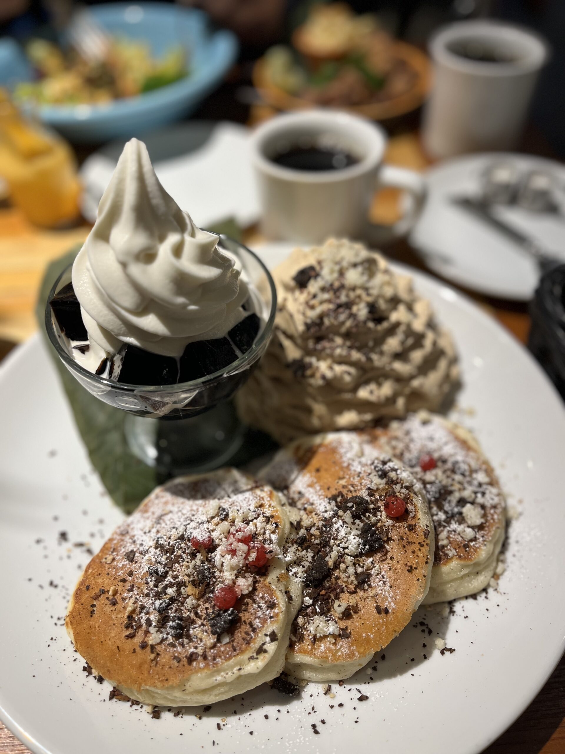 生クリームとコーヒーゼリーたっぷりの甘いパンケーキ!