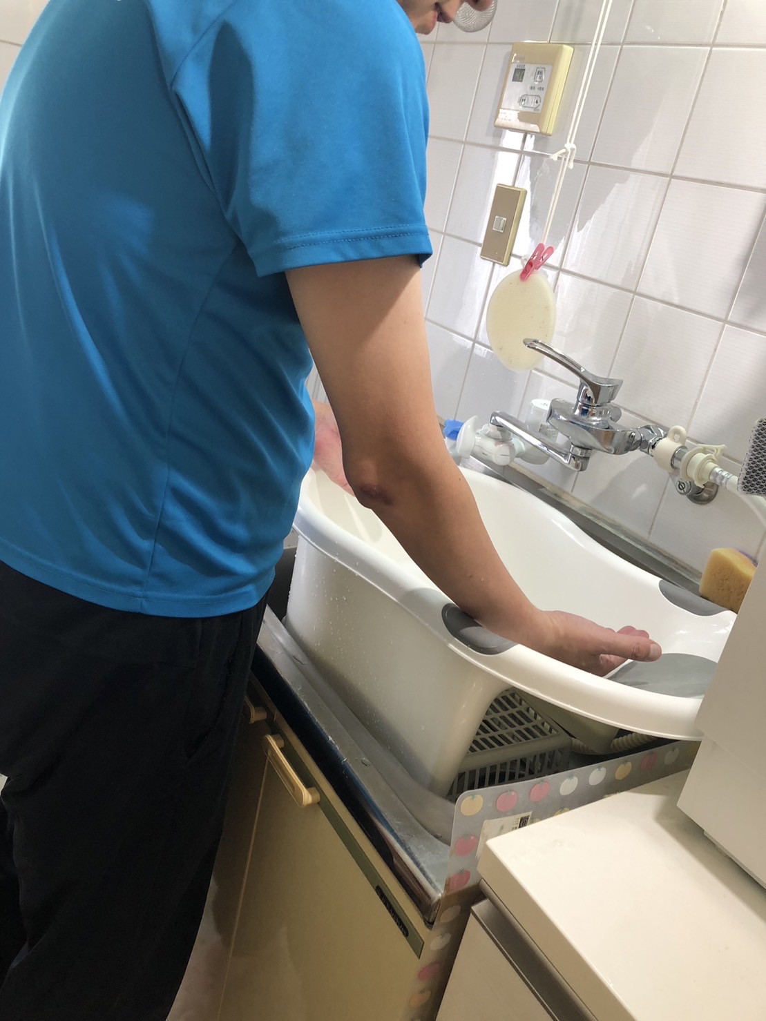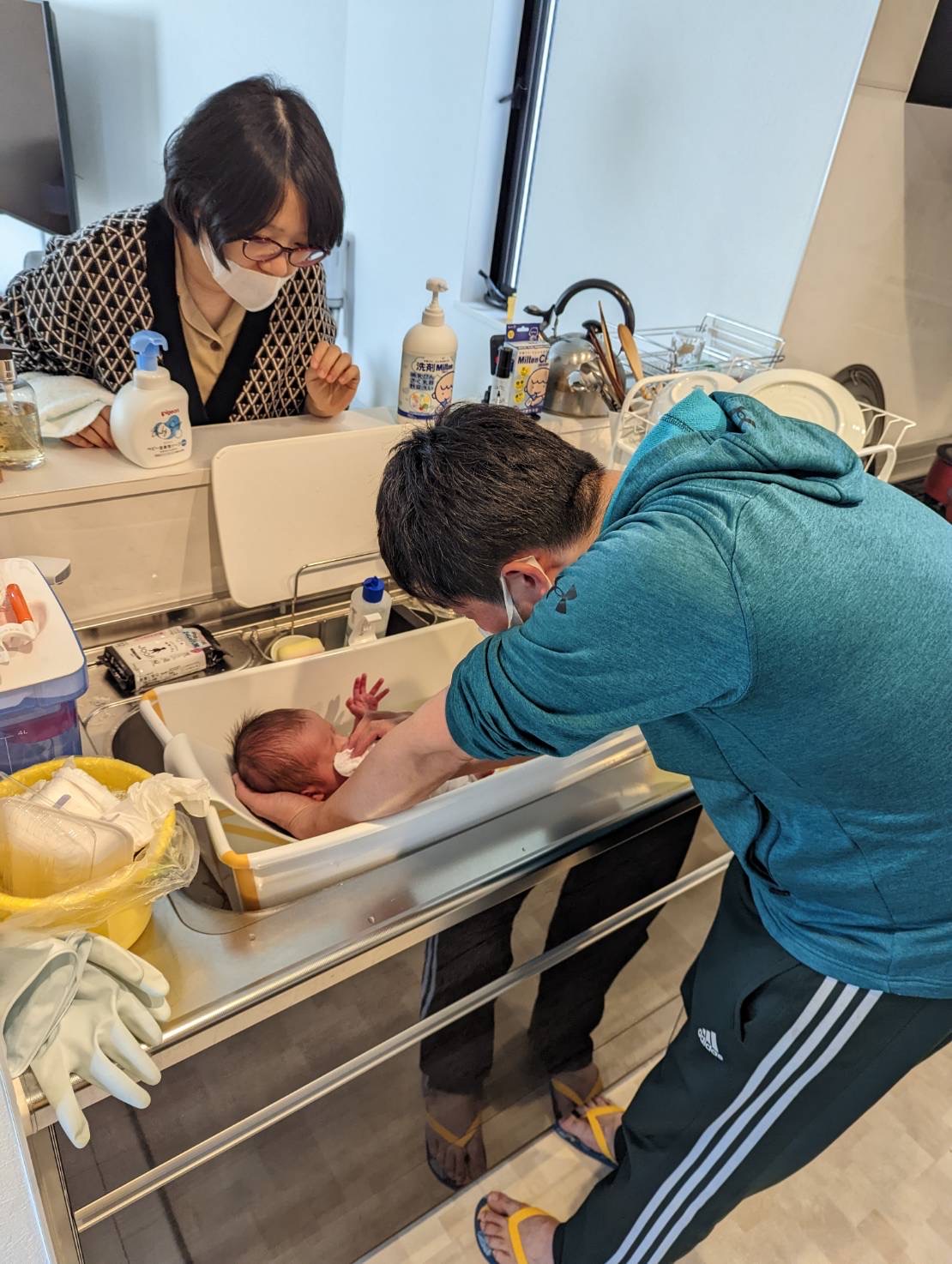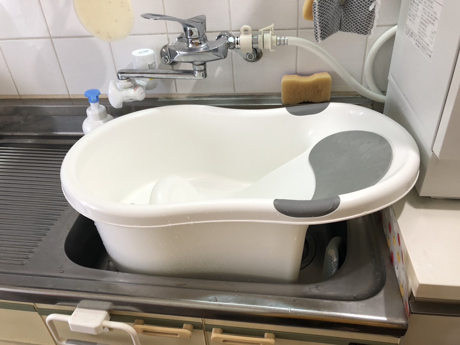 キッチンのシンクを使っての沐浴は産後ママには腰への負担が少なく