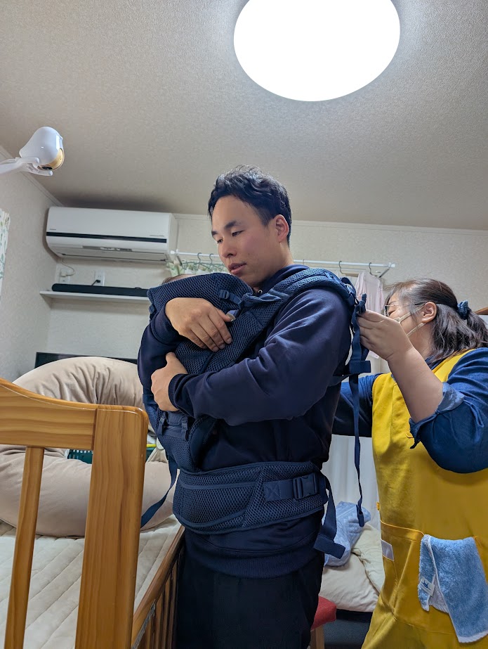 産後ヘルパーと抱っこ紐の練習をしたとき。
